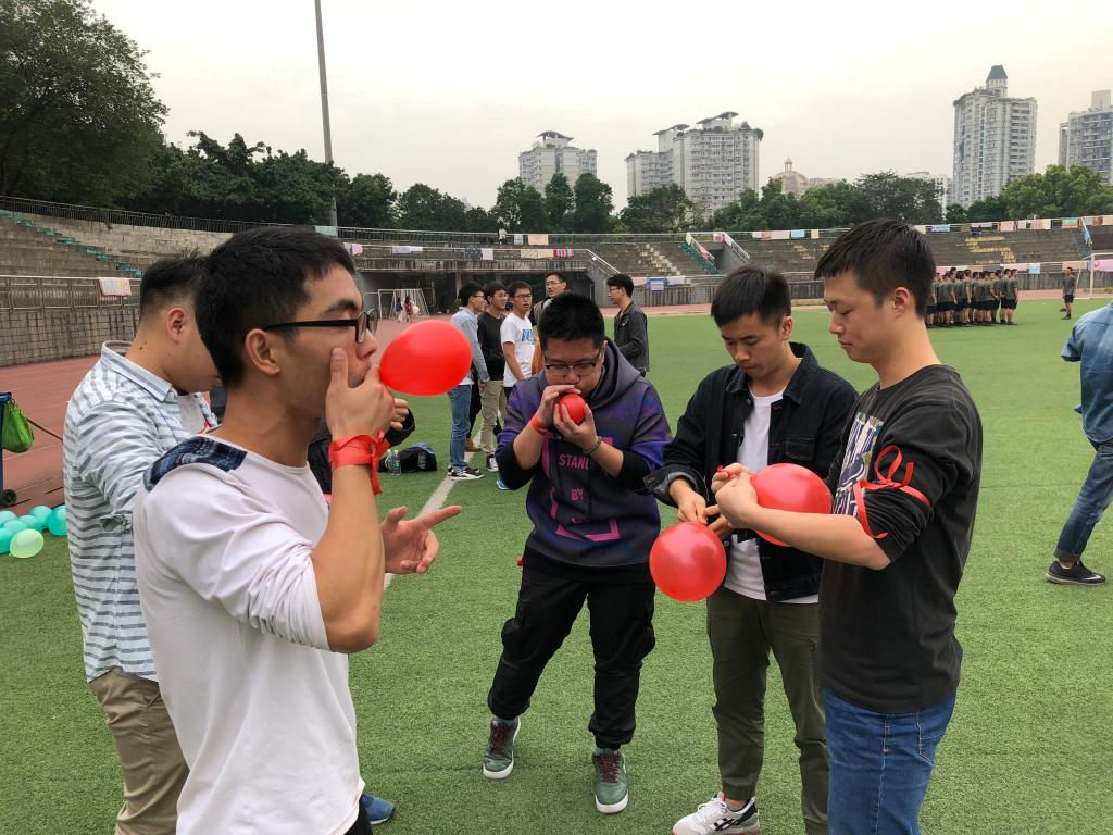 然后是“双龙戏珠”,大家需要在一定时间内吹气球,并且两人用除四肢的其他身体部位来运送气球。负责吹气球的同学腮帮鼓鼓,迅速吹起气球;运气球的同学有的手忙脚乱,气球一下就飞起来,有的同学配合默契,稳扎稳打,运送数目不断增加。紧张的气氛弥漫全场,汗水挥发,脚步飞驰,最后各组都取得了不错的成绩。