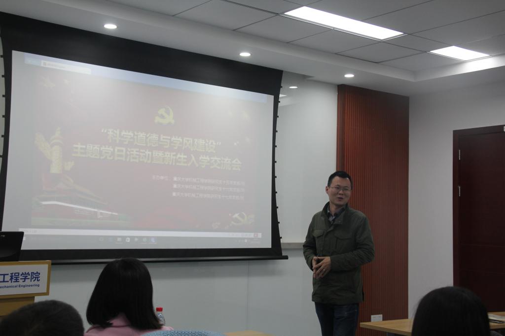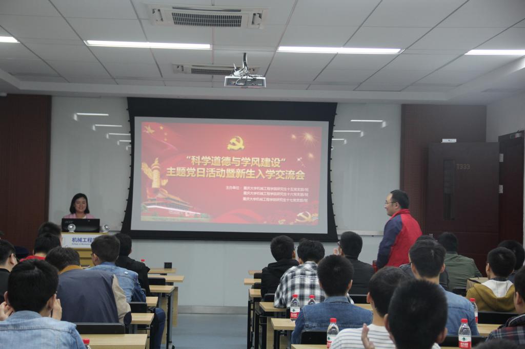 2018年10月25日晚上7:00,由机械公司研究生十五、十六、十七支部联合举办的“科学道德与学风建设”暨新生入学交流主题党日活动在七教333会议室正式举办。本次活动由三个支部的副书记朵为鑫、罗雪清、黄艺共同主持。出席本次活动的老师有十五支部书记程敏老师和十六支部书记刘富樯老师。机械工程公司党委副书记陈晓慧老师对本次活动进行了视察,并提出了指导性意见。