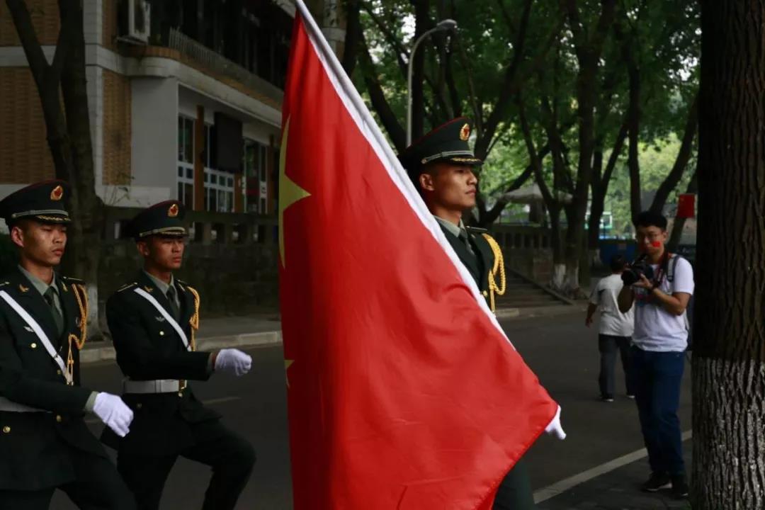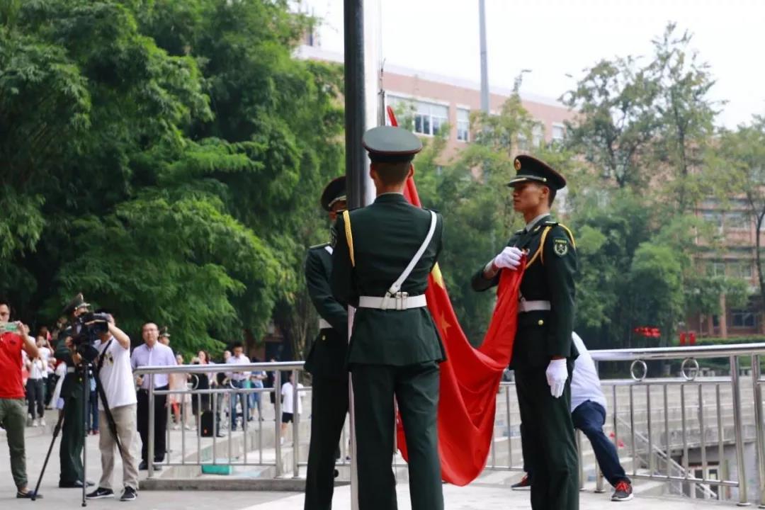 歌声毕,上午8时许,全体师生整齐列队。在全体人员的注目下,国旗护卫队队员迈着铿锵有力的步伐来到升旗台前,立正、展旗、敬礼,护送鲜艳的五星红旗冉冉升起,迎风飘扬。全体师生高唱国歌,庄严肃穆,饱含对祖国的无限热爱和崇高敬意。