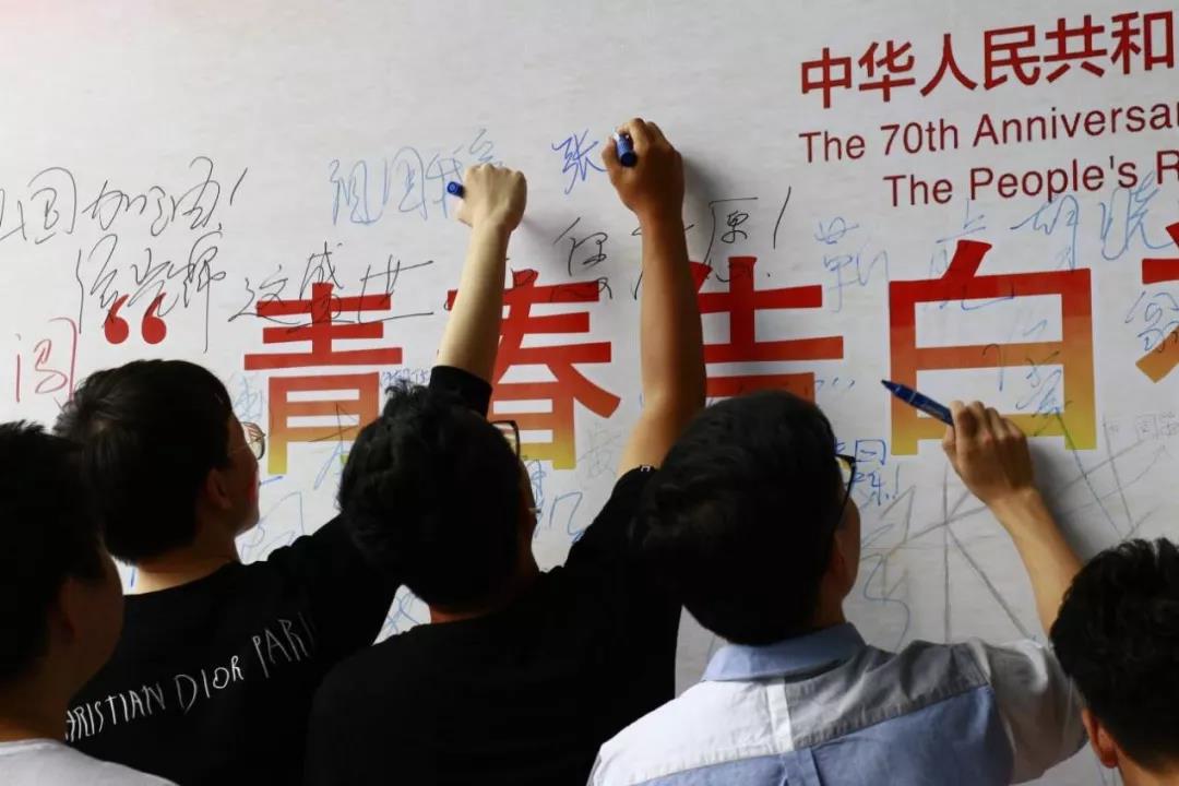 升旗仪式结束后,同学们前往林荫道上的巨幅签名墙参加“青春告白祖国”活动,机械公司的同学们都积极主动签上了自己的名字,为祝福祖国70华诞留下了见证。