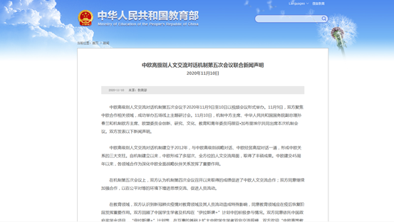 10日中欧高级别人文交流对话机制第五次会议于通过视频连线方式召开。国务院副总理孙春兰与欧盟委员会创新、研究、文化、教育和青年委员加布里埃尔共同出席,双方发表了联合新闻声明。提到“在教育领域,双方认识到新冠肺炎疫情对教育领域及其人员流动造成特殊影响,同意教育领域应在疫后恢复阶段发挥重要作用。双方回顾了中国员工学者及机构在“伊拉斯谟+”计划中的积极参与情况。双方同意依托中国政府奖学金项目、“伊拉斯谟+”计划等,在互惠的基础上扩大中欧员工学者双向交流规模。双方欢迎“中欧高等教育质量对标与学分互认项目”研究团队发布学分互认指导纲要,以促进高等教育机构的兼容性。双方支持中欧高等教育机构通过多种方式联合培养高层次人才。“