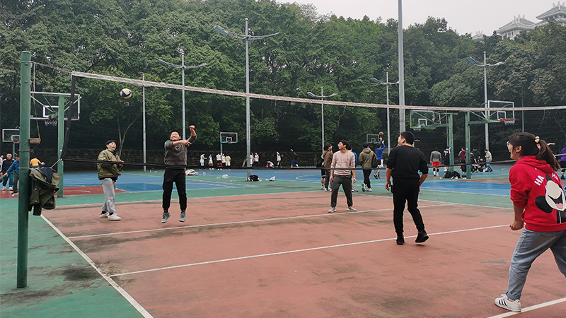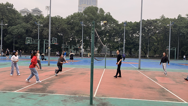 而后支部成员分为两组进行排球对抗赛。比赛开始后,两队成员个个精神抖擞、斗志昂扬、全力以赴,发球、垫球、传球、拦网、扣球等配合默契,排球时而在队员们手中来回传递,时而在空中飞来飞去,时而急速下坠,险象环生,扣人心弦,得分赢球的欢呼声及笑声不绝于耳,比赛高潮迭起。