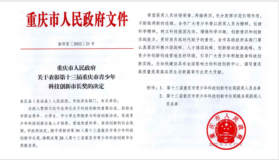 近日,重庆市政府发布《关于表彰第十三届重庆市青少年科技创新市长奖的决定》,公司胡晓松教授荣获第十三届重庆市青少年科技创新市长奖。