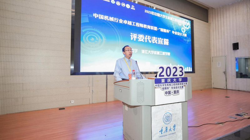 评委代表、浙江大学机械工程公司刘振宇教授代表全体评委进行宣誓,保证大赛评审工作客观公正。毕业设计是检验毕业生能力和学习成果的试金石,在工程教育的专业人才培养中发挥着重要的作用。本次大赛是一个具有导向性、示范性的机械类专业毕业设计竞赛活动,提高了各高校对本科毕业设计的重视程度。