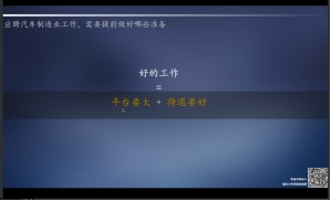 最后,时老师介绍了应聘汽车制造业工作需要做好的准备。首先,时老师提到好的工作等于平台要大和待遇要好,其中,就业者更应关心优质的工作平台。
